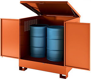V503260012 Armadio con vasca di contenimento con capacità 280 lt per stoccaggio fino a 4 fusti da 200 lt dim. 1340x1250x1420H mm colore arancio RAL 2001 PZ1